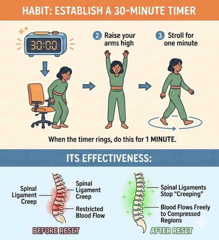 Establish a 30-minute timer as your habit. In response to its triggering, get to your feet, raise your arms high, or stroll for one minute.
